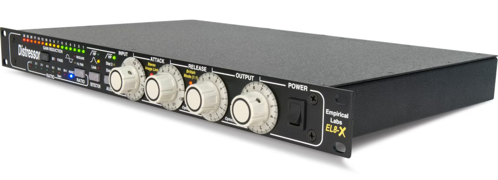 The concept of British Mode came from an unusual setting on the classic UREI LN1176 limiter. The unit was designed to have only four ratios, each ratio being engaged by selecting one of four buttons. However, as early as 1980 (or before), renegade recording engineers, always on the lookout for something a little more “over-the-top”, found that you could make all four buttons stay in if you pressed them just right. What resulted was a very aggressive sound that had some elements of the unit’s 20:1 ratio, but with an unusual knee and new envelope shape. Somewhere along the line, someone called it “British Mode”, and the name stuck. The EL8-X has the advantage of being able to selectively apply this aggressive characteristic – not just to the new “British” ratio (1:1) – to any of the ratios, simply by engaging the dedicated “British Mode” switch.