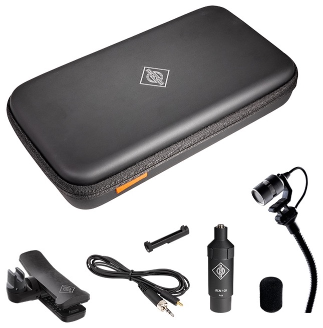 Complete set for using the Miniature Clip Mic system on the bell of a trumpet, trombone, saxophone or other horn, on percussion instruments and on pole stands. Contains: KK 14 capsule, SH 150 gooseneck, KC 1 cable brace, AC 31 cable, MCM 100 output stage, WS 110 wind shield, MC 6 clip. Delivered in a handy soft case.