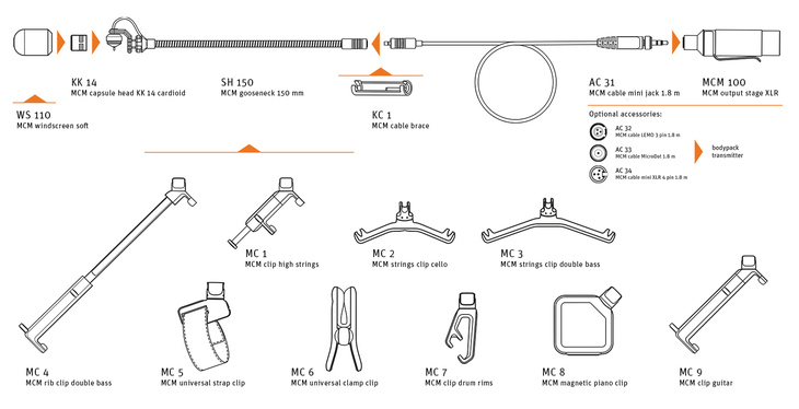 Complete set for using the Miniature Clip Mic system on the body of a violin, viola, mandolin or similar instrument. Contains: KK 14 capsule, SH 100 gooseneck, KC 1 cable brace, AC 31 cable, MCM 100 output stage, WS 110 wind shield, MC 1 clip. Delivered in a handy soft case.