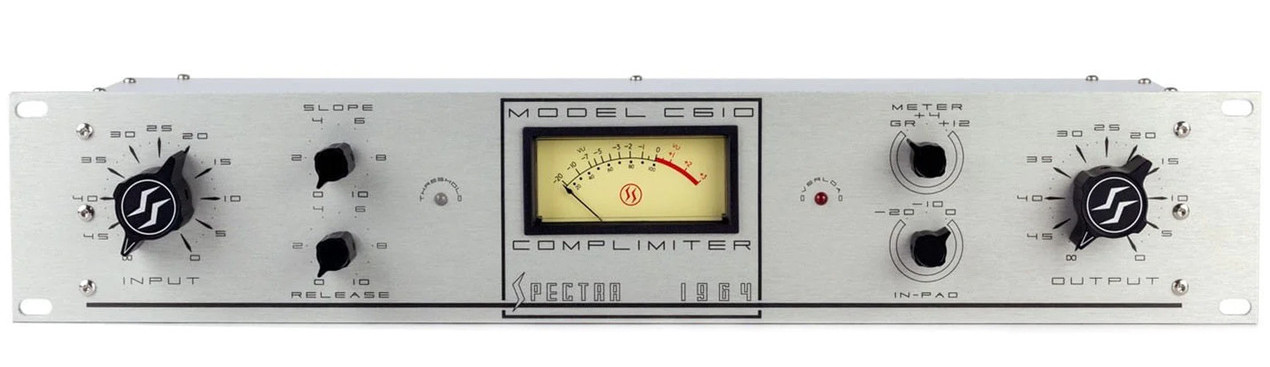 Today Spectra introduces the Spectra 1964 Model C610 Complimiter. True to the original, the C610 still utilized the unchanged and unmatched 601 Compressor/Limiter circuit and a 101 amplifier for make-up gain. Spectra's improvements include XLR and Phoenix I/O, highest quality input/output transformers, selectable input padding, buffered true VU metering, and multi-stage overload indication.