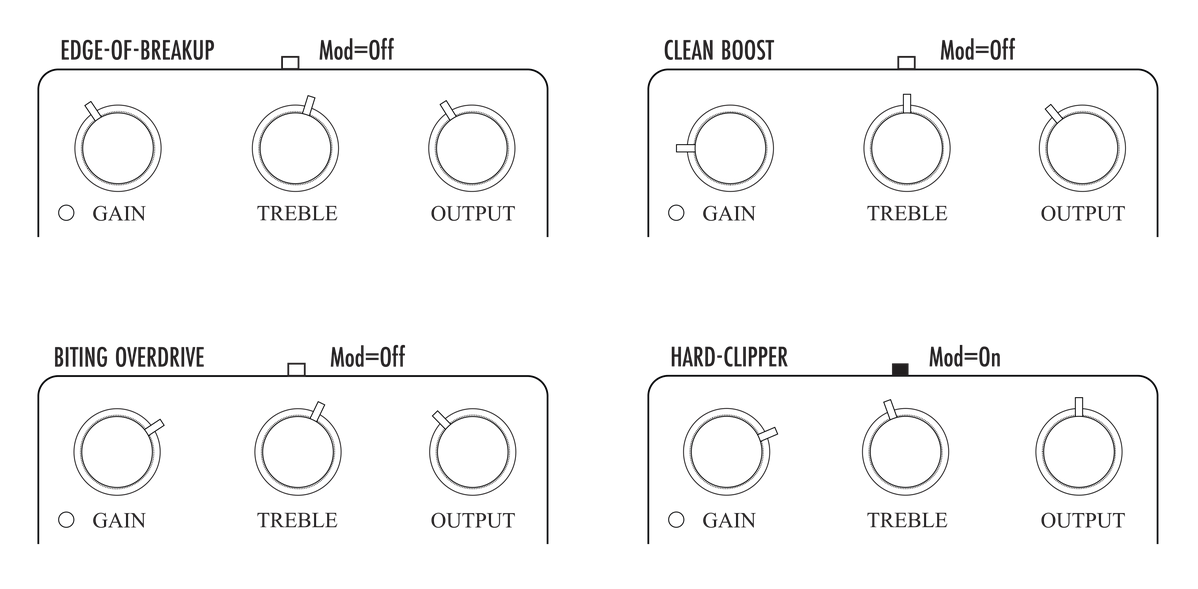 Whether you’re after the fabled boost tones, edge-of-breakup overdrive, or you want to push your rhythm channel to true grit - the Centavo has all of the adored tones of the original pedal. The Centavo is comfortable acting as a boost pedal, but the saturation in the higher gain settings provide a platform for true “transparent” overdriven rhythm tones. The addition of the “MOD” switch on the back - famously requested by Jeff Beck on the original pedal- allows players to extend the bass response, impacting the lower strings to get added low end drive tones.