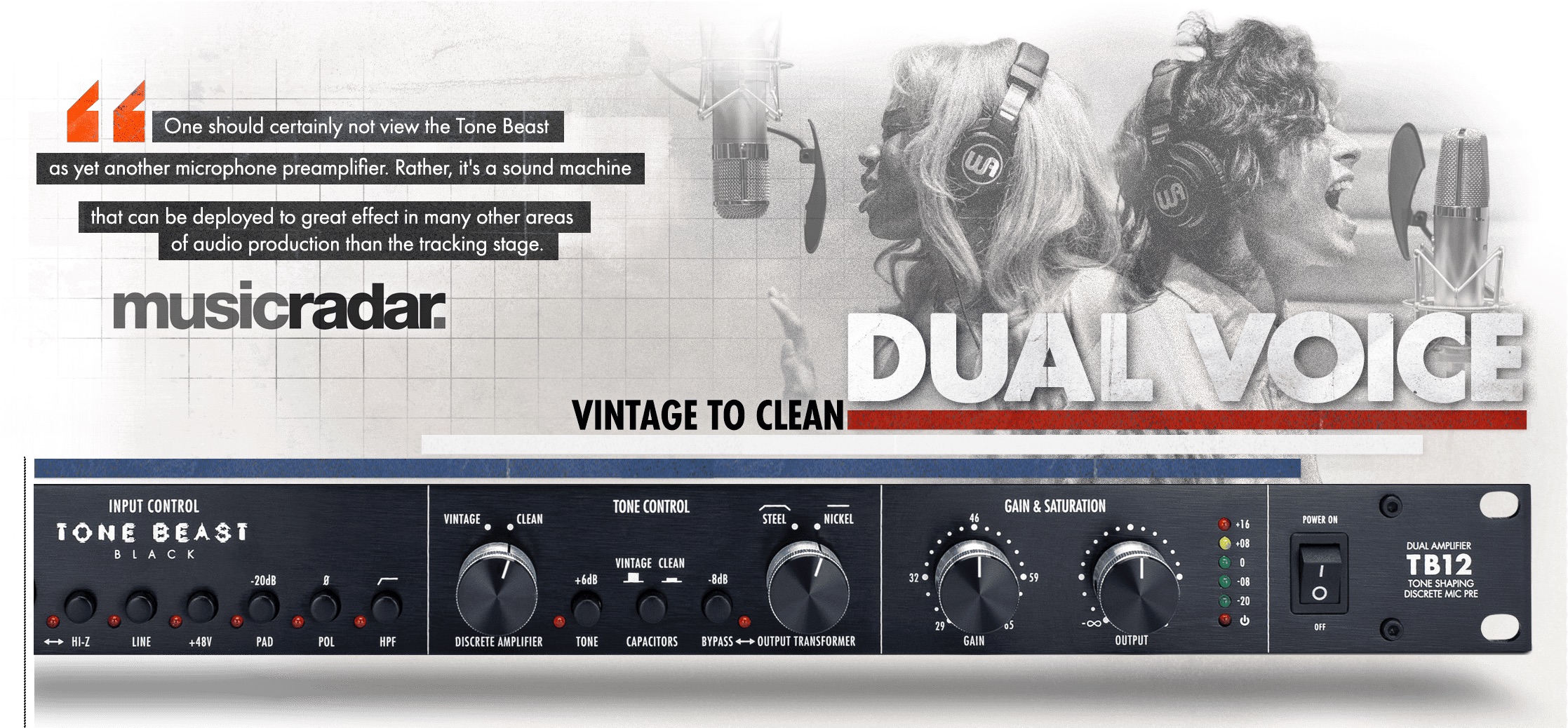 The Tone Beast is a single-channel, console-grade mic pre with user-switchable tone control for shaping your sound. Like the original “clean-to-mean" 12-style preamps, the TB12 delivers the best of punchy, clear tones with the option to add the saturated, bold tones of famous, vintage mods. A sonic range favored by artists like Prince, Beck, Pearl Jam, Toto, The Eagles, R.E.M & many more.